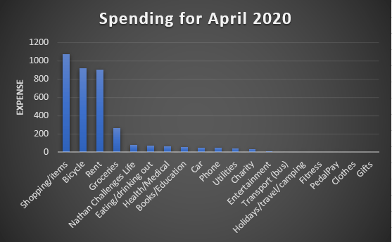 There were a lot of things I didn’t spend money on. The biggest items bought during April were a new phone as my old one was getting really slow, and I used some of my car recall money to buy an e-bike conversion kit for my current bicycle! Really keen to try it out.