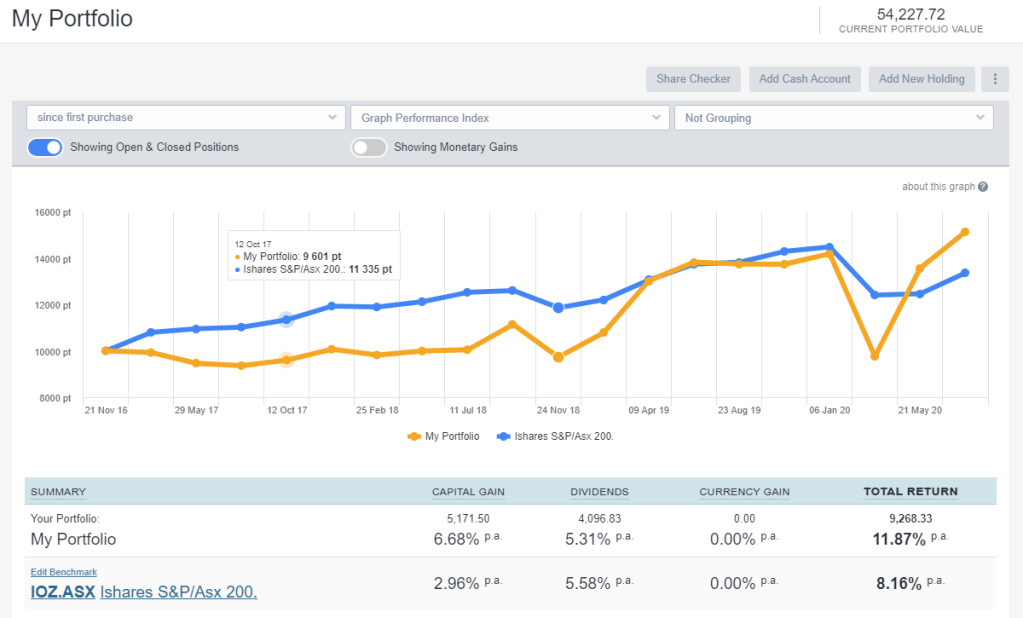 I logged into ShareSight and input my data from my current positions and previous sold positions. I love doing this every year to really see how my portfolio is going compared to the market.