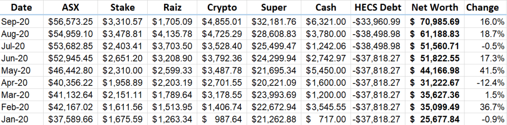 Throughout August, my networth grew another massive 16%! So happy to see it growing. This was helped by a few things such as my HECS debt dropping due to tax return, my super going up, as well as my cash deposits towards my house deposit has grown quite well. See table below for a run down of each contributer: