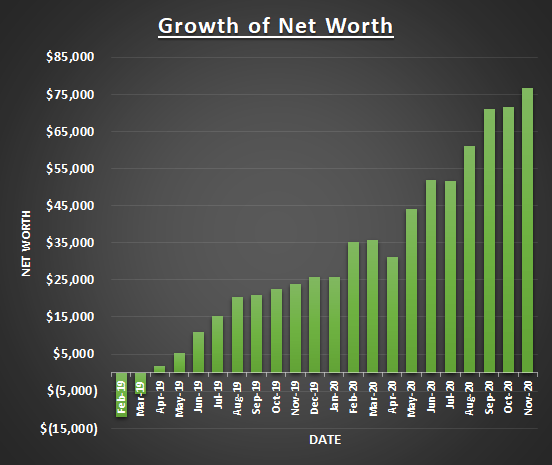 Throughout October, my net worth grew by $5,150 (7.2%) to $76,547. I’m happy with the growth over the month, and with only a few more months until the end of 2020, I’ll need a few good months to get close to, or reach my goal of $100,000. Check out the table below for the breakdown of my networth components: