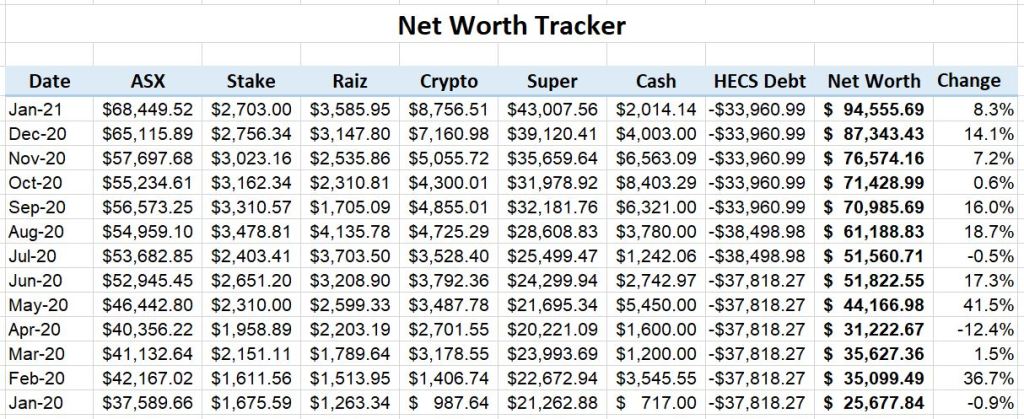 I saw some really good growth in pretty much all of my investment accounts. It was good to see a decrease in my HECS Debt, which will go down slowly over the next 10 years. Great to see another 8.3% increase over December.