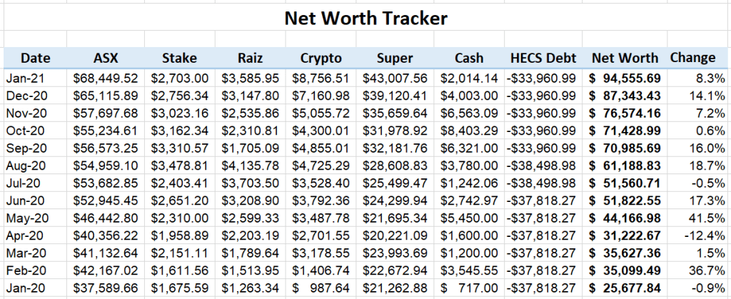 - I started the year at $25,677. At the end of 2020, I managed to grow my net worth to $94,555! Incredibly happy with my progress, but unfortunately JUST didn’t reach my goal. My average growth of net worth each month came out to be 12.4%.
