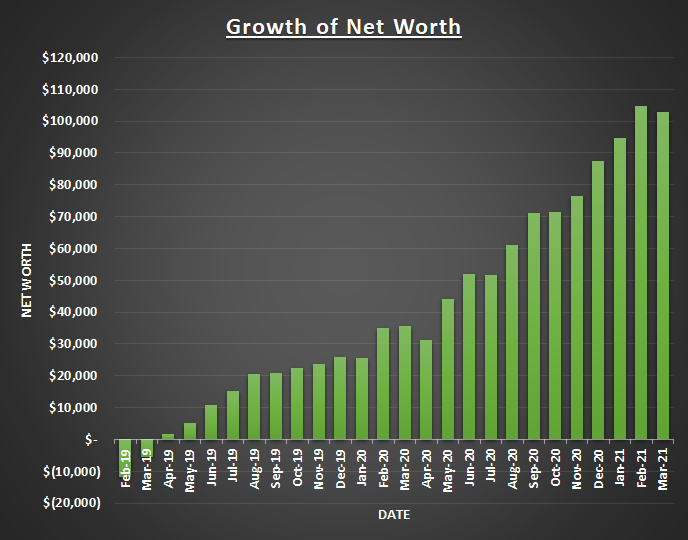 - My net worth decreased to $102,854 over February. It’s only a slight decrease, as can be seen from the graph below. There has been quite a volatile market over the past few weeks, so my main portfolio and super are slightly lower than last month. While the stock market has gone down, the word on everyone’s lips, bitcoin/crypto has gone up quite dramatically, which helped to ensure my net worth didn’t drop too much.