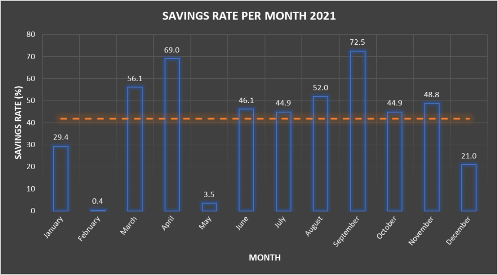 - Yearly savings rate was 41.8%! I’m really happy and excited to see that my savings rate was still so high even after all my spending.